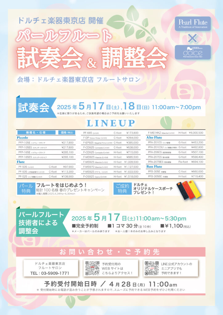 2025年5月17日(土)~18日(日)、ドルチェ楽器東京店 フルートサロンにてパールフルート試奏会&調整会が行われます。