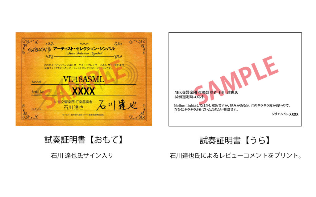 合わせシンバルとして、多彩な音色と煌びやかなサウンドを備え、優れたレスポンスで吹奏楽によくマッチする、アーティザン・トラディショナル・シンフォニックミディアムライトの18インチモデル、また、サスペンドシンバルには深みのあるトーンとクレシェンド時のクイックレスポンスが人気のアーティザン・トラディショナルシンフォニック・サスペンド18インチをチョイス。今回、NHK交響楽団 打楽器奏者の石川 達也氏が厳選したセレクションシンバル(試奏証明書付き)を限定数量ご用意いたしました。