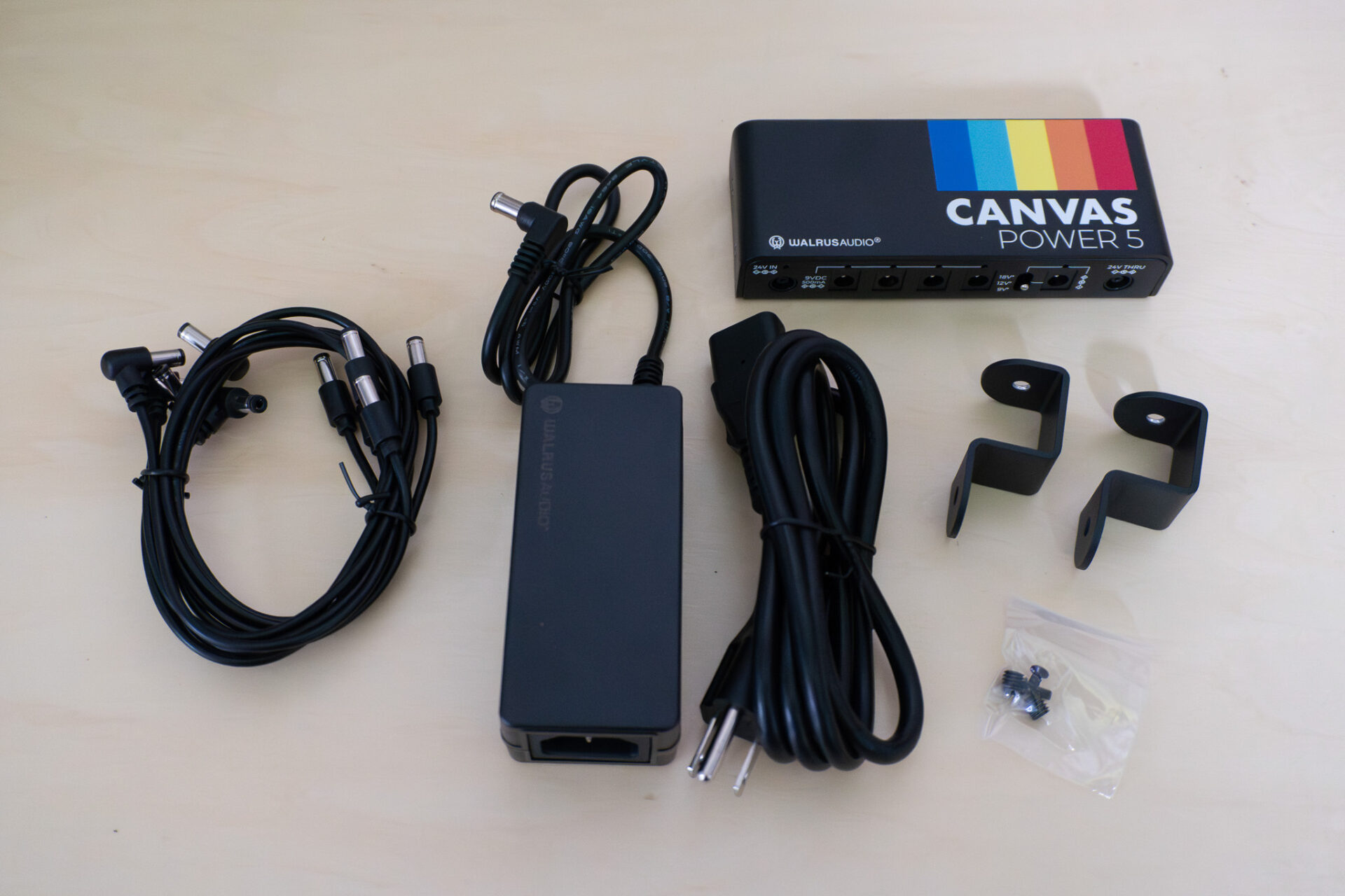 Canvas Power 5 には、9V で最大 500mA のクリーンな電力を供給する 5 つの独立した電源出力があります。うち1 つは可変電圧で、9V、12V、18V を切り替えて高電圧ペダルに電力を供給できます。
